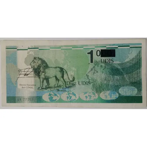 | Obverse lettering | 10 UDIS DIEZ UDIS Director Ejecutivo Red COMAL SOLO SE PUEDE GASTAR CON MIEMBROS SPENDABLE WITH MEMBERS ONLY NUR BEI MITGLIEDERN EINLÖSBAR À UTILISER UNIQUEMENT AVEC DES MEMBRES APENAS PODE SER GASTO COM MEMBROS (Translation: 10 UDIS (Solidarity Exchange Unit) UDIS = Unidad de Intercambio Solidario) |