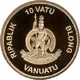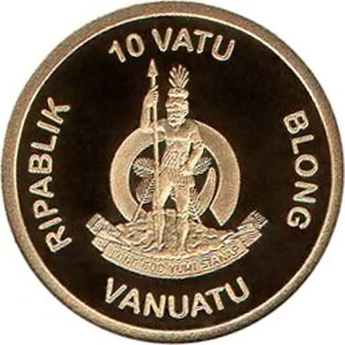 The arms of Vanuatu featuring a Melanesian warrior standing in front of a curved boar`s tooth above a scroll reading `LONG GOD YUMI STANAP` and the face value above. |
