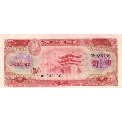 | Obverse lettering | 조선민주주의인민공화국 조선중앙은행 십원 1959 (Translation: Democratic People`s Republic of Korea, Central Bank of North Korea, Ten Won) |