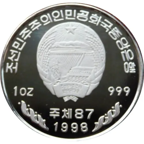| Надписи аверса | 조선민주주의인민공화국중앙은행 1 OZ 999 주체87 1998 (Translation: Central Bank of the Democratic People`s Republic of Korea) |
