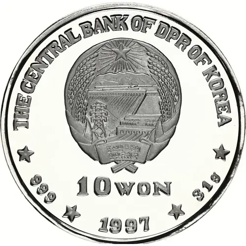 | Obverse lettering | THE CENTRAL BANK OF DPR OF KOREA 10 WON 999 31g 1997 |