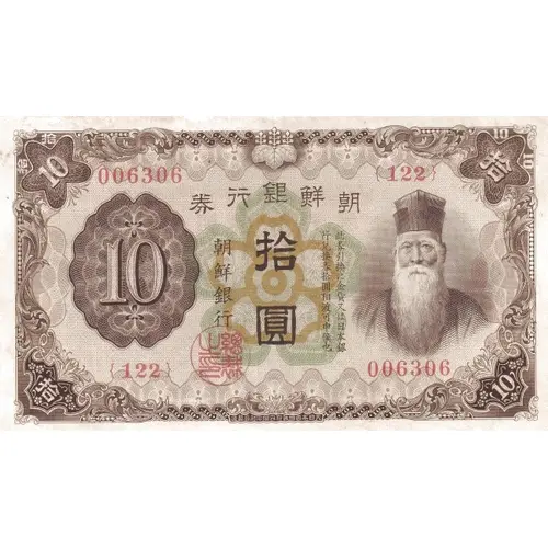 | Vorderseitenlegende | 券行銀鮮朝 行銀鮮朝 拾 圓 (Translation: Banknote of the Chosen Bank, Bank of Chosen, Ten Yen) |