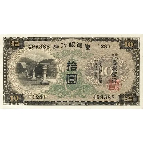 | نوشتههای روی اسکناس | 券行銀灣臺 相此 臺 拾 渡券 灣 圓 可引 銀 申換 行 俟に 也金 拾 圓 造裝局翂印閣內府政國帝本日大 |