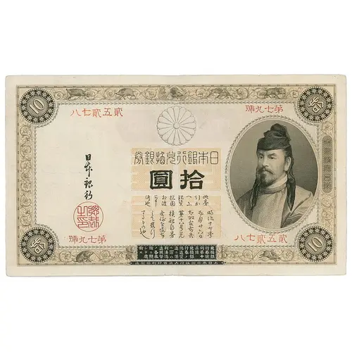| Obverse lettering | 10 拾 和氣清麻呂卿 券銀換兌行銀本日 日 圓拾 本 候可相拾銀へ引此 銀 也申渡圓貨尓か券 行 す奉条換第太五明 るし例銀十政月治 もてを行八官廿十 の發遵券號布六七 也行 兌告日年 之總 印裁 断シ條ノ造刑ル造偽行兌 ステニ各紙法罪ニ造券換 處照本幣偽ハ係變ノ銀 拾 10 造幣局刷印府政國帝本日大 (Translation: Bank of Japan convertible note Bank of Japan Ten yen This bill can be exchanged for ten yen in gold. These are issued in compliance with the provisions of the Ordinance of the Grand Council of State No. 18 of May 6th, year 17 of Meiji (1884) on convertible banknotes. The crime of altering and reproducing a convertible banknote shall be dealt with in accordance with this article 12 of the Penal Code. Wake no Kiyomaro Empire of Japan Printing Bureau) |