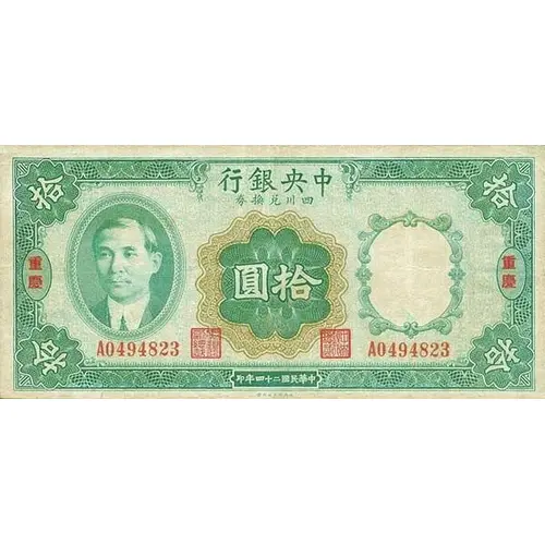 | Reverse lettering | The Central Bank of China Promises to pay the bearer on demand at its office here Ten Yuan Local Currency Chungking |