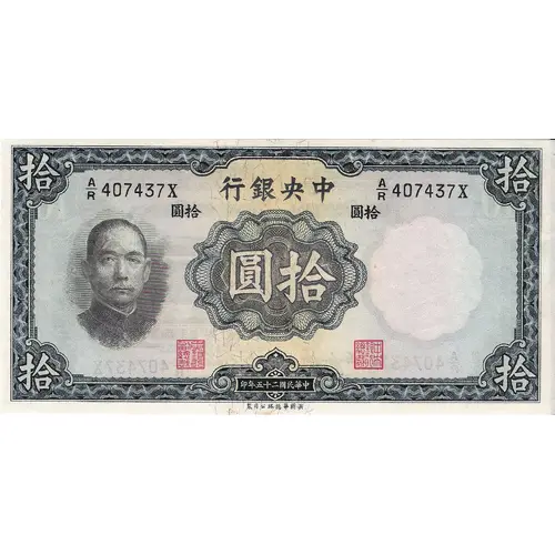 | Reverse lettering | THE CENTRAL BANK OF CHINA TEN YUAN NATIONAL CURRENCY 1936 WATERLOW & SONS LIMITED, LONDON. |