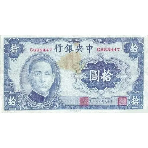| Obverse lettering | 行銀央中 圓拾 年一十三國民華中 (Translation: Central Bank of China Ten Yuan Printed in the 31st year of the Republic of China) |