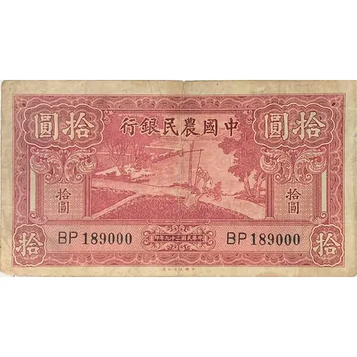 | Obverse lettering | 行銀民農國中 圓 拾 印年九十二國民華中 司公業大國中 (Translation: The Farmers Bank of China 10 Yuan Printed in the 29th year of the Republic of China China Taye Printing Company) |