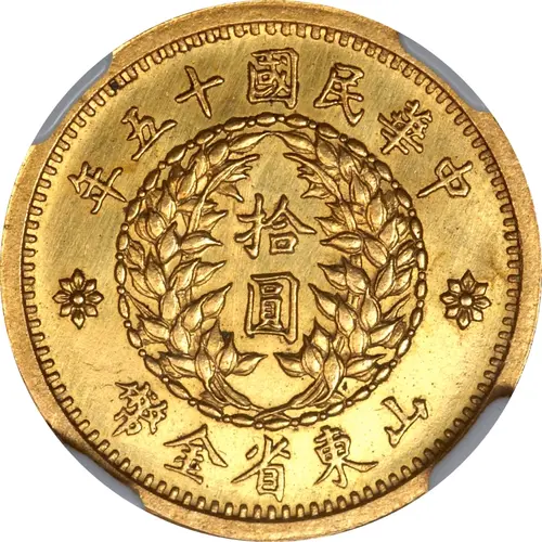 | Obverse lettering | 年五十國民華中 拾 圓 幣金省東山 (Translation: Year 15 of the Republic of China 10 Yuan Shantung Province Gold Coin) |