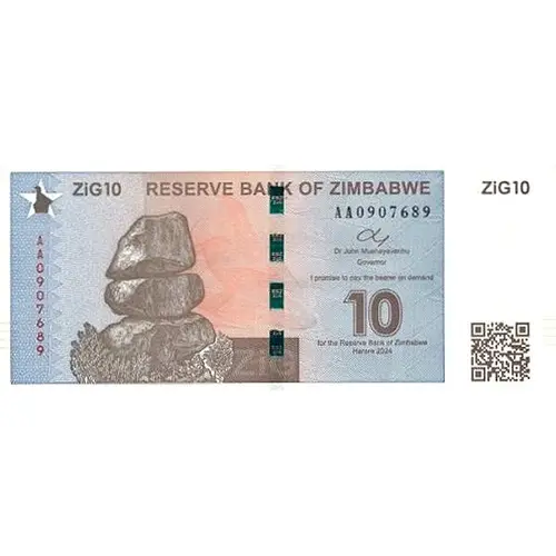 ZiG10 RESERVE BANK OF ZIMBAWE ZiG10 I promise to pay the bearer on demand 10 for the Reserve bank of Zimbabwe Harare 2024 |