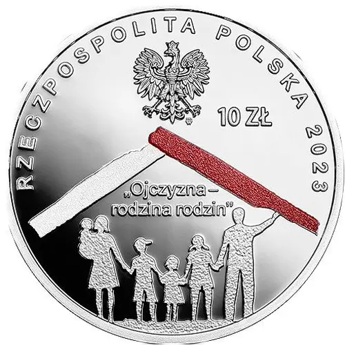 | Obverse lettering | RZECZPOSPOLITA POLSKA 2023 10 ZŁ mw „Ojczyzna – rodzina rodzin” (Translation: Republic of Poland The Homeland – a Family of Families) |