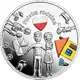 | Reverse description | A heart with colors of Polish flag. Above an inscription. Surrounding, from left to right, two flower, a sister and brother holding soccer ball, a stroller, a cat, a father holding stroller, a mother holding baby, a colorized flower, a colorized house, a girl holding flag, a dog. |