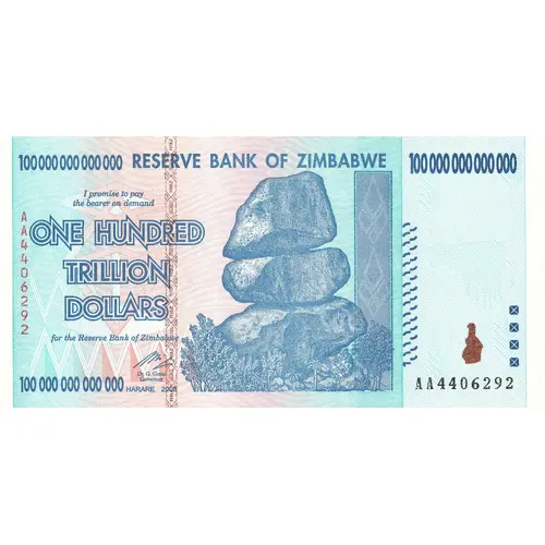 100 000 000 000 000 RESERVE BANK OF ZIMBABWE I promise to pay the bearer on demand ONE HUNDRED TRILLION DOLLARS for the Reserve Bank of Zimbabwe HARARE 2008 |