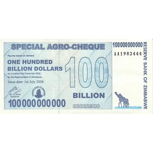 SPECIAL AGRO-CHEQUE RESERVE BANK OF ZIMBABWE Pay the bearer on demand ONE HUNDRED BILLION DOLLARS on or before 31st December 2008 for the Reserve Bank of Zimbabwe Issue date: 1st July 2008 |