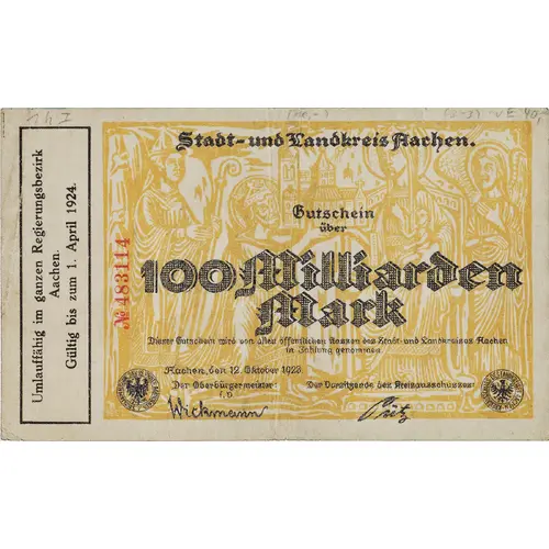 Stadt und Landkreis Aachen Gutschein über 100 Milliarden Mark Dieser Gutschein wird von allen öffentlichen Kassen des Stadt- und Landkreises Aachen in Zahlung genommen Aachen, den 12. Oktober 1923 Der Oberbürgermeister: |