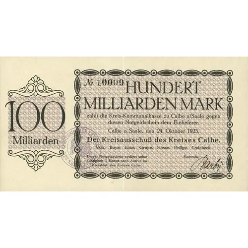 | Obverse lettering | Hundert Milliarden Mark zahlt die Kreis-Kommunal-Kasse zu Calbe a/Saale gegen diesen Notgeldschein dem Einlieferer. Calbe a. Saale, den 24. Oktober 1923. Der Kreisausschuss des Kreises Calbe. Voß. Bohe. Ecke. Grube. Halle. Hellge. Ladebeck. Kontrolle: hdschr. Uschr. Dieser Notgeldschein verliert seine Gültigkeit 1 Monat nach Aufruf im Kreisblatt des Kreises Calbe. Stempel: Preuss. Landrat |