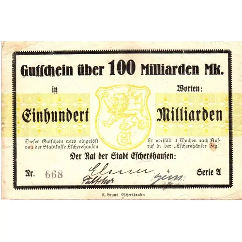 Gutschein über 100 Milliarden Mk. in Worten Einhundert Milliarden Dieser Gutschein wird eingelöst von der Stadtkasse Eschershausen. Er verfällt 4 Wochen nach Auf- ruf in der `Eschershauser Ztg.` Der Rat der Stadt Eschershausen (Translation: Voucher for 100 billion marks. In words: One hundred billion This voucher is redeemed by the Eschershausen City Treasury. It expires four weeks after its publication in the `Eschershauser Ztg.` The Eschershausen City Council) |