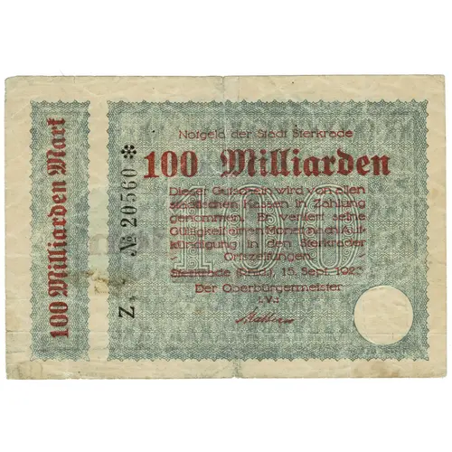 100 Milliarden Mark Notgeld der Stadt Sterkrade 100 Milliarden Dieser Gutschein wird von allen städtischen Kassen in Zahlung genommen. Er verliert seine Gültigkeit einen Monat nach Auf- kündigung in den Sterkrader Ortszeitungen. Sterkrade (Rhld.), 15. Sept. 1923 Der Oberbürgermeister (Translation: 100 Billion Marks Emergency Money of the City of Sterkrade 100 Billion This voucher is accepted by all municipal treasuries. It expires one month after its cancellation in the Sterkrade local newspapers. Sterkrade (Rhineland), September 15, 1923 The Mayor) |