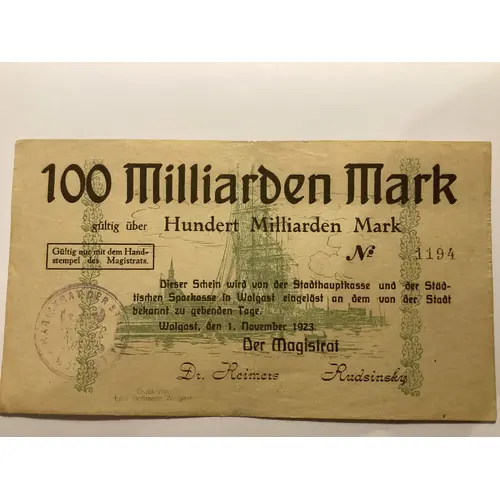 | Obverse lettering | 100 MILLIARDEN MARK Gültig guter Hundert Milliarden Mark Dieser Schein wird von der Stadthauptkasse und der Städtischen Sparkasse in Wolgast eingelöst an dem von der Stadt bekannt zu gebenden Tage Wolgast,den 1.November 1923 Gültig Gnus mit dem Handstempel des Magistrats Der Magistrat. Dr.Reimers. rudsinsky |
