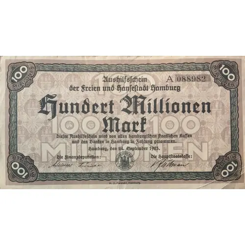 | Obverse lettering | 100 MILLIONEN 100 MILLIONEN 100 100 100 MILLIONEN Aushilfschein der freien und hansestadt Hamburg A 088982 Hundert Millionen Mark Dieser Aushilfschein wird von allen hamburgischen Staatlichen Kassen und den Banken in Hamburg in Zahlung genommen. Hamburg, den 24. September 1923. Die Finanzdeputation: Die hauptstaadtkasse: FINANZDEPUTATION HAMBURG H. O. Persiehl, Hamburg. 100 MILLIONEN 100 MILLIONEN |