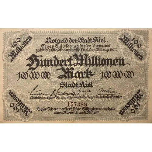| Obverse lettering | 100 Millionen(4) Notgeld der Stadt Kiel Gegen Einlieferung dieses Scheines zahlt die Stadthauptkasse Kiel den Betrag von HUNDERT MILLIONEN MARK 100 000 000(2) Stadt Kiel Oberbürgermeister.Bürgermeister.Stadt Vorsteher.Stelln.Stadtn.Vorsteher Dieser Schein verliert feine Gültigkeit innerhalb eines Monats nach Aufruf |