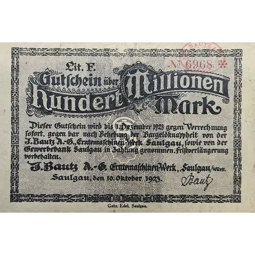 | Legenda del dritto | Gutschein über Hundert Millionen Mark Dieser Gutschein wird bis 1. Dezember 1923 gegen Verrechnung sofort, gegen bar nach Behebung der Bargeldknappheit von der J. Bautz A.-G., Erntemaschinen-Werk Saulgau, sowie von der Gewerbebank Saulgau in Zahlung genommen. Fristverlängerung vorbehalten. J. Bautze A. G. Erntemaschinen-Werk, Saulgau/Württ. Saulgau, den 10. Oktober 1923 |