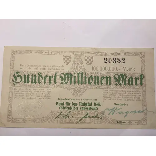 | Légende de l’avers | Dem Einreicher dieses überweisen wir auf sein Bank-Konto 100.000.000.-Mark Die Einreichung kann direkt oder durch Vermittlung einer Bank oder Sparkasse erfolgen.Soweit Reichsbanknoten zur Verfügung stehen,erfolgt ein Umtausch gegen diese. Dies Zwischenquittung wird ungültig,wenn sie nicht innerhalb eines Monats nach erfolgter Bekanntmachung im Amtsblatt für den Landesteil Birkenfeld bei der Bank eingereicht wird. Birkenfeld=Nahe,den 5 Oktober 1923 Bank für das Nahetal A=G.(Birkenfelder Landesbank) Kontrolle:Kassierer. |