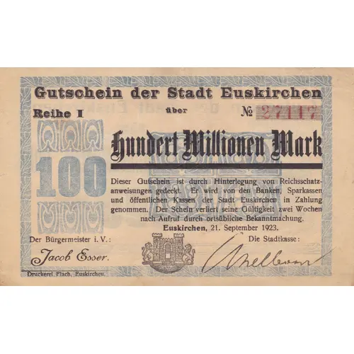 | Legenda awersu | Gutschein der Stadt Euskirchen Reihe I über No Hundert Millionen Mark Euskirchen, 21. September 1923. |