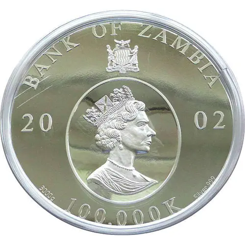 | Obverse lettering | BANK OF ZAMBIA 20 02 3000g 100.000 K Silver 999 |