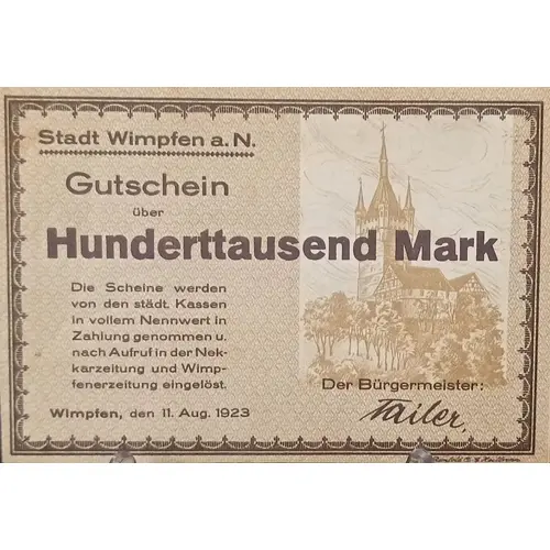 Gutschein über Hunderttausend Mark Stadt Wimpfen a.N. Die Scheine werden von den stadt Kassen in vollen Nennwert in Zahlung genommen u. nach Aufruf in der Nekkarzeitung und Wimpfenerzeitung eingelöst. Wimpfen, den 11.Aug.1923 (Translation: Voucher for a hundred thousand marks City of Wimpfen The vouchers are accepted by the city cash registers in full face value and redeemed after being called up in the Neckar and Wimpfen Wimpfen, August 11, 1923) |