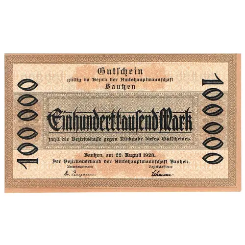 | Chữ khắc mặt trước | Gutschein gültig im Bezirk der Amtshauptmannschaft Bautzen Einhunderttausend Mark zahlt die Bezirkskasse gegen Rückgabe dieses Gutscheines Bautzen, am 22. August 1923 Der Bezirksverband der Amtshauptmannschaft Bautzen |