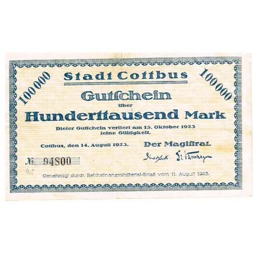| Obverse lettering | Stadt Cottbus Gutschein über Hunderttausend Mark Dieser Gutschein verliert am 15. Oktober 1923 seine Gültigkeit. Cottbus, den 14. August 1923 |
