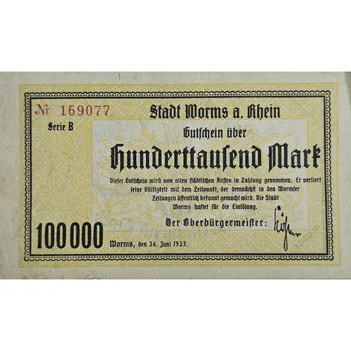 | Obverse lettering | Stadt Worms a. Rh. Gutschein über Hunderttausend Mark Dieser Schein wird von allen Städtischen Kassen in Zahlung genommen. Er verliert seine Gültigkeit mit dem Zeitpunkt, der demnächst in den Wormser Zeitungen öffentlich bekannt gemacht wird. Die Stadt Worms haftet für die Einlösung. Worms, den 26. Juni 1923 |