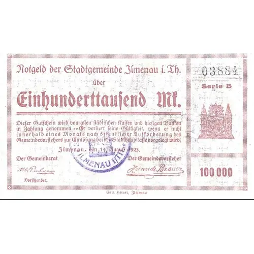(Translation: Emergency money from the municipality of Ilmenau I. Th for One hundred Thousand Marks This voucher is accepted by all urban races and local Banten in payment. Fr loses its validity if it is not submitted to the city chief for collection within one month of the public request of the town clerk Ilmenau, August 14, 1923 The Council The community leader) |