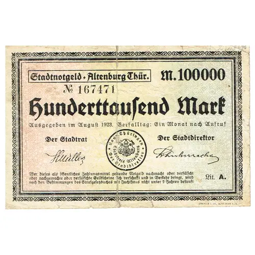 | Obverse lettering | Stadtnotgeld * Altenburg Thür. M. 100000 Hunderttausend Mark Ausgegeben im August 1923. Verfalltag: Ein Monat nach Aufruf |