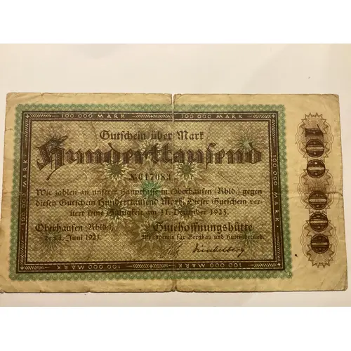 Gutschein über Mark HUNDERTTAUSEND Wie zahlen an unserer Hauptkasse in Oberhausen (Rhld.)gegen diesen Gutschein Hunderttausend Mark.Dieser Gutschein verliert feine Gültigkeit am 31.Dezember 1923 Oberhausen (Rhld.) den 1.Juni 1923. Guttehoffnungshutte Aktienverein für Bergbau und Hüttenbetrieb |
