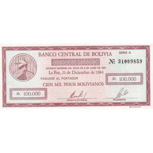 | 表面の銘文 | BANCO CENTRAL DE BOLIVIA CHEQUE DE GERENCIA DECRETO SUPREMO NO. 20272 DE 5 DE JUNIO DE 1984 La Paz, 21 de Diciembre de 1984 PAGUESE AL PORTADOR $B. 100.000,00 CIEN MIL PESOS BOLIVIANOS $B. 100.000,00 (Translation: Central Bank of Bolivia Management Check Supreme Decree # 20272 of June 5th., 1984 La Paz, December 21st., 1984 Be paid to the bearer $b. 100,000.00 One Hundred Thousand Pesos Bolivianos $b. 100,000.00) |
