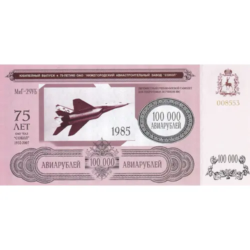 | Obverse lettering | ЮБИЛЕЙНЫЙ ВЫПУСК К 75-ЛЕТИЮ OAO `НИЖЕГОРОДСКИЙ АВИАСТРОИТЕЛЬНЬІЙ ЗАВОД `СОКОЛ` ДВУХМЕСТНЫЙ УЧЕБНО-БОЕВОЙ САМОЛЕТ ДЛЯ ПОДГОТОВКИ ЛЕТЧИКОВ ВВС МиГ-29УБ 75 ДЕТ ОАО `НАЗ `CОKOЛ` 1932-2007 АВИАРУБЕЙ 500000 АВИАРУБЕЙ (Translation: ANNIVERSARY ISSUE FOR THE 75TH ANNIVERSARY OF THE NIZHNY NOVGOROD AIRCRAFT PLANT `SOKOL` TWO-SEAT COMBAT TRAINER AIRCRAFT FOR TRAINING AIR FORCE PILOTS MiG-29UB 75 `FALCON` 1932-2007 AVIATION ROUBLES 100000 AVIATION ROUBLES) |