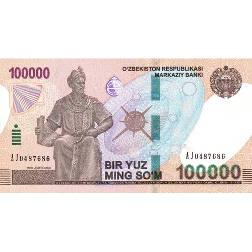 | Opschrift keerzijde | OʻZBEKISTON RESPUBLIKASI MARKAZIY BANKI 100000 BIR YUZ MING SOʻM OʻZBEKISTON SOʻMINI QALBAKILASHTIRISH QONUNGA MUVOFIQ TAʼQIB QILINADI (Translation: Central Bank of the Republic of Uzbekistan, One Hundred Thousand So‘m, Counterfeiting of the Uzbek so‘m is prosecuted in accordance to the law) |