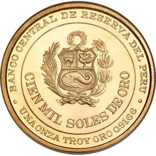 | Obverse lettering | BANCO CENTRAL DE RESERVA DEL PERU CINCUENTA MIL SOLES DE ORO UNA ONZA TROY ORO 0.9166 |