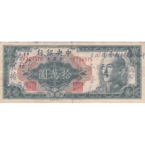 | Obverse lettering | 行銀央中 券圓金 圓萬拾 (Translation: Central Bank of China Gold Yuan note One Hundred Thousand Yuan) |