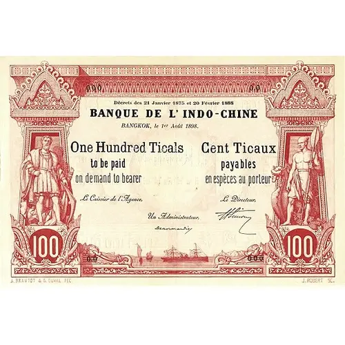 Décrets des 21 Janvier 1875 et du 20 Février 1888 BANQUE DE L`INDO-CHINE BANGKOK, le 1ᵉʳ Août 1898. One Hundred Ticals to be paid on demand to bearer Cent Ticaux payables en espèces au porteur Le caissier de l`Agence, Le Directeur, Un Administrateur, 100 100 A. BRAMTOT & G. DUVAL FEC. J. ROBERT SC |