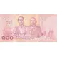 | Descrizione del rovescio | Red print; multicolour underprint Half-length figure of King Rama V and King rama VI, both front-facing but have eyesight toward the center. Rava V`s royal trip to Notodden, Norway, on a car driven by Sam Eyde to the lower left of Rama V. King Rama VI riding horse, founding of Thai Boy Scouts to the lower right of King Rama VI. Trishula trident in Chakra on guillochés background, to the upper right of King Rama VI. Arabic numerals denomination on guillochés background, on upper-left; Thai numerals denomination on bottom-left corner. EURion constellations on lower-left corner, top-right corner, and bottom-right corner. Uniline repeating microtexts `100` hidden background motifs. |