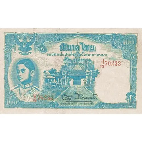 | Obverse description | Blue print; red prefix and serial numbers; black signature. Bust of Rama VIII facing half left on the left. Front elevation of Entrance gate to the ordination hall with Yaksha guardian statues, in wat Arun (Temple of Dawn). Garuda on top-left corner, Arabic denominations on top-right and bottom-left corner, three-headed-elephant Airavata on bottom right corner. Arabic numerals serials center right and bottom left. |