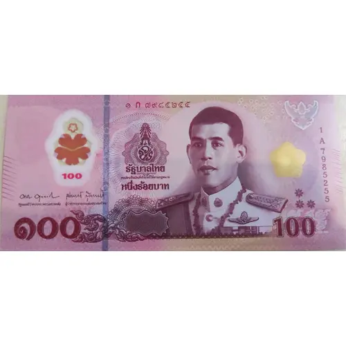 Red print; multicolour underprint; red serial numbers; black signatures. Bust of King Vajiralongkorn, in the uniform of the commander of the Royal Thai Air Force, facing slightly left. Crowned "วปร" monogram, surmounted by Great Crown of Victory with "๑๐"-shaped Unalom inside, emitting 17 rays from top jewel of the crown, on guillochés background in the center. Thai numerals denomination on bottom-left corner; Arabic numerals denomination on bottom-right corner. Perfect registration printed Garuda on upper-right corner. Five-pedals-flower-shaped transparent window with golden '100' in the centre of inverted five-pedals-flower prined with special ink, red ink that change to purple on certain angle, with smaller five-pedals-flower-shaped transparent window at upper has multiline repeating small embossed '100', to the left of monograms. Golden five-pedals-flower with translucent inverted pentagon centre, to the right of king's head. EURion constellations on upper right of king's head. Dense repeating microtexts '100' in the shadow to the left of king's neck; dense repeating microtexts '100' near Arabic numerals denomination; uniline repeating microtexts '100' along guillochés surrounding the monogram. Latent number '100' on the left of king's shoulder, visible from bottom-left to center. Vertical metallic security thread, which can change color from pink to green when looking from different angle, with repeating "100 BAHT 100 บาท" inside, to the left. Tactile ten slanted bars on center-left and center-right edge; tactile eight-pedals-flower arranged as ⠓, Braille 'H', abbriviation for 'hundred'. |