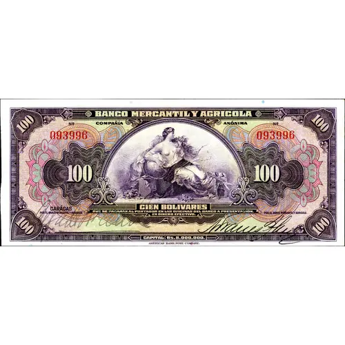 | Obverse lettering | BANCO MERCANTIL Y AGRICOLA COMPAÑÍA ANÓNIMA 100 CIEN BOLIVARES QUE SE PAGARÁN AL PORTADOR EN LAS OFICINAS DEL BANCO A PRESENTACIÓN, EN DINERO EFECTIVO. CARÁCAS POR EL BANCO MERCANTIL Y AGRICOLA CAPITAL: Bs. 8.000.000. (Translation: Merchand and Agricultural Bank, anonymous company 100 One hundred Bolívares that will be paid at bank`s offices to bearer on presentation, in cash. Caracas By Merchant and Agricultural Bank Capital: 8 000 000 Bolívares) |