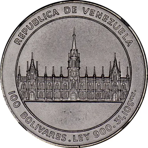 | Obverse lettering | REPUBLICA DE VENEZUELA 100 BOLIVARESLEY 900 31,10 gms (Translation: Venezuela Republic 100 Bolivares 0.900 31.1 grams) |