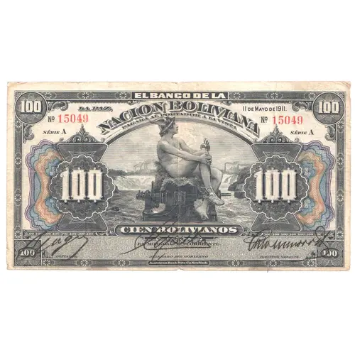 (Translation: The Bank of the La Paz, May 11th., 1911 Bolivian Nation Will pay the bearer at sight One Hundred Bolivianos in current money)