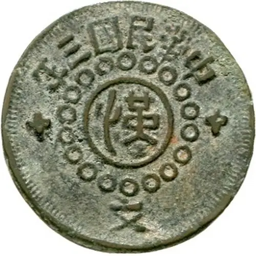 | Description du revers | Four Chinese ideograms read top to bottom, right to left, all surrounded by more ideograms. |