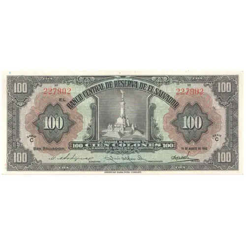 (Translation: Central Reserve Bank of El Salvador Pay to Bearer One Hundred Colones In accordance with Article 39 of its Constitutive Law San Salvador)